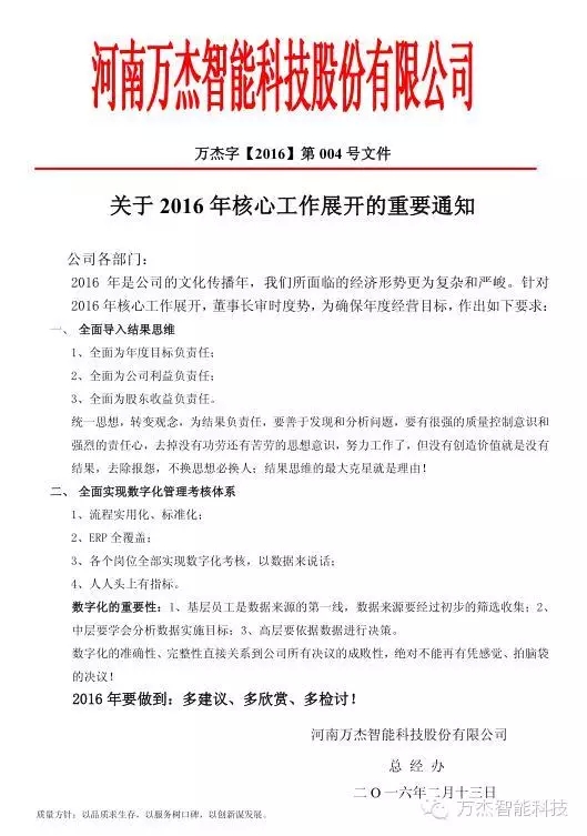 2016年,是萬杰智能的文化傳播年,我們所面臨的經濟形勢更為復雜和嚴峻。董事長王曉杰審時度勢,為確保年度經營目標,針對2016年核心工作展開提出兩個全面要求: