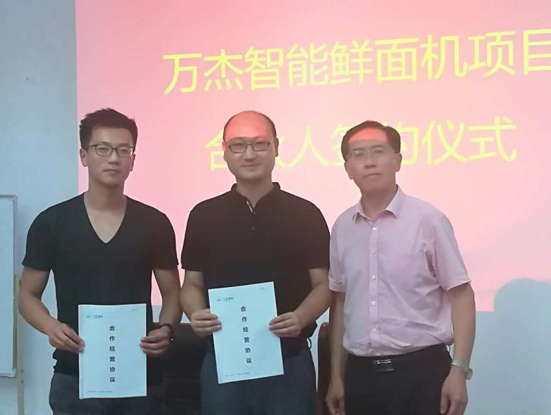2017年8月11日,萬杰智能鮮面機首輪招商的末尾,令人感動的是,山西省長治市萬福糧油有限公司王總和楊總、江蘇省蘇州市優面糧油食品有限公司蘇總,不愿錯過首輪招商的機會,專程駕車五六個小時,直奔萬杰智能本部,趕在截止時間18:00前完成簽約,成為萬杰智能鮮面機在長治市和蘇州市的合伙人。