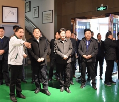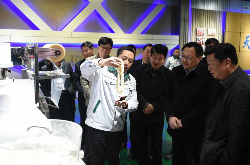 許昌市統戰部部長劉保新與襄城縣縣長李成一行在董事長王曉杰陪同下參觀公司展廳,詳細了解了公司的產品機構和企業文化,特別是在公司展廳了解到高端制面機項目的總體規劃和發展成績后對萬杰智能的發展表示高度贊揚